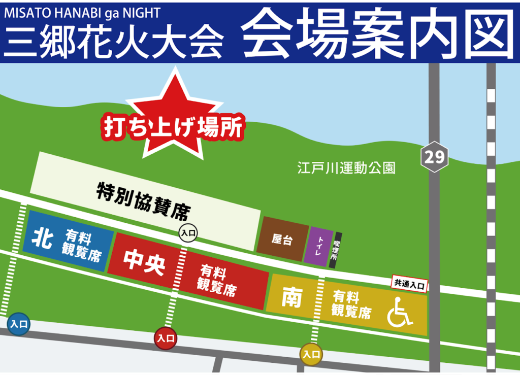 三郷花火大会は安全対策のため、会場の多くが有料観覧席となっています。
